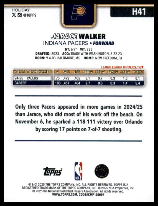 2025-26 Topps Holiday Jarace Walker #H41 Indiana Pacers Basketball Card NBA