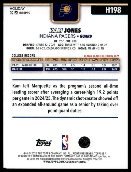 2025-26 Topps Holiday Kam Jones Rookie #H198 Indiana Pacers Basketball Card NBA