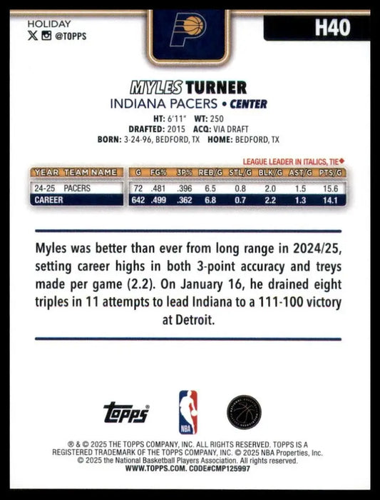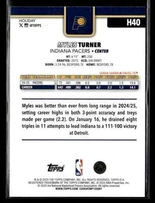 2025-26 Topps Holiday Myles Turner #H40 Indiana Pacers Basketball Card NBA Sport