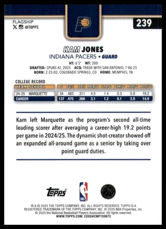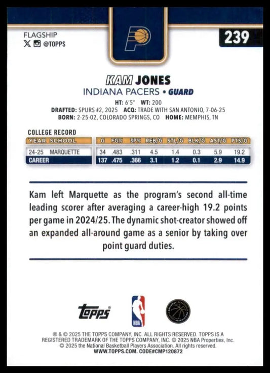 2025-26 Topps Holo Foil Kam Jones Rookie #239 Indiana Pacers Basketball Card NBA