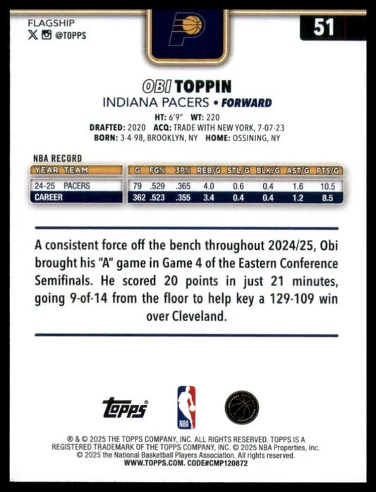 2025-26 Topps Obi Toppin #51 Indiana Pacers Basketball Card NBA Sports