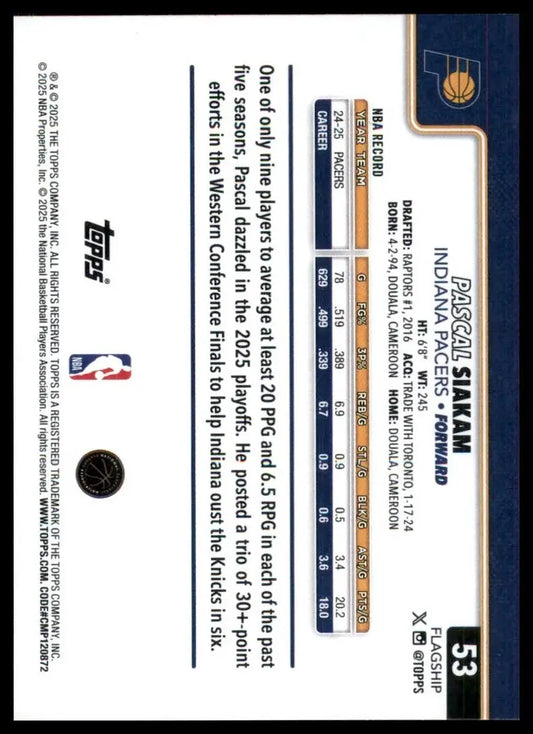 2025-26 Topps Pascal Siakam #53 Indiana Pacers Basketball Card NBA Sports