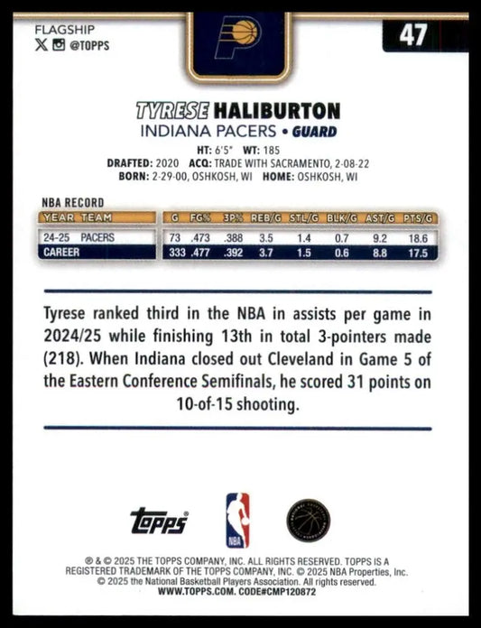 2025-26 Topps Tyrese Haliburton #47 Indiana Pacers Basketball Card NBA Sports