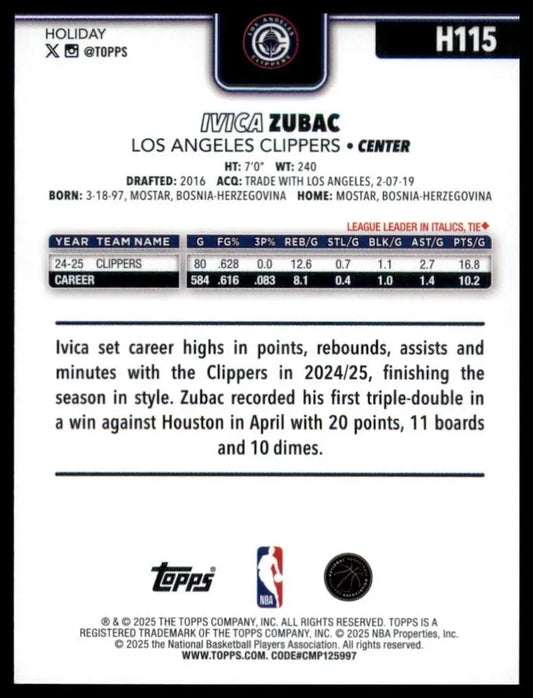 2025-26 Topps Holiday Ivica Zubac #H115 Los Angeles Clippers Basketball Card NBA