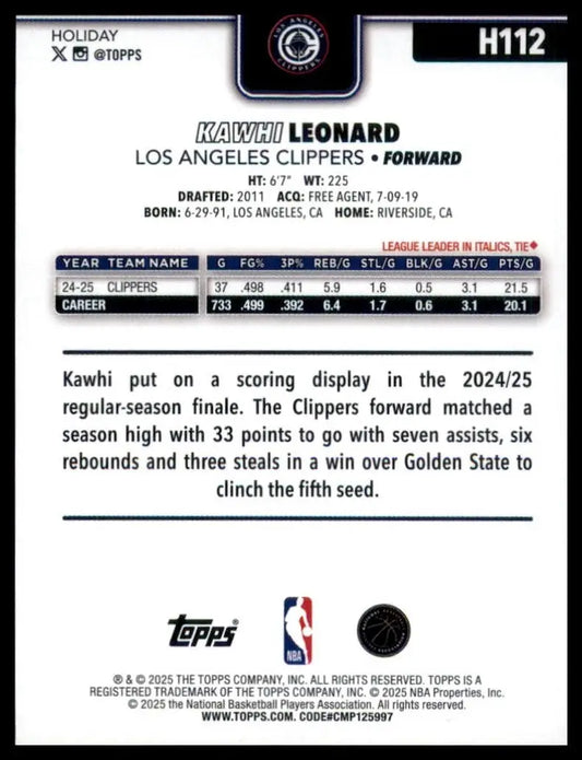 2025-26 Topps Holiday Kawhi Leonard #H112 Los Angeles Clippers Basketball Card