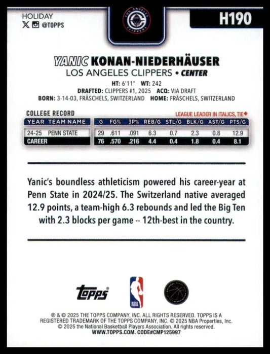 2025-26 Topps Holiday Yanic Konan Niederhauser Rookie #H190 Los Angeles Clippers