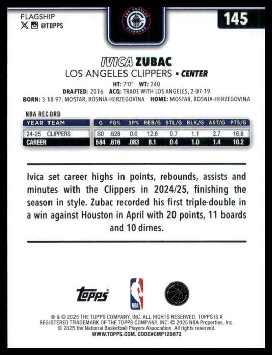 2025-26 Topps Ivica Zubac #145 Los Angeles Clippers Basketball Card NBA Sports