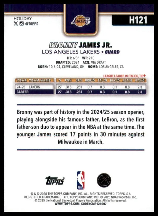 2025-26 Topps Holiday Bronny James Jr #H121 Los Angeles Lakers Basketball Card
