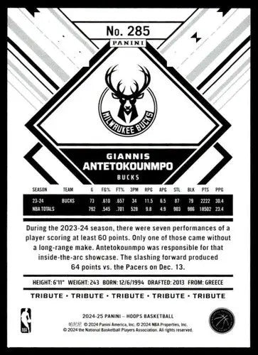 2024-25 Panini Hoops #285 Giannis Antetokounmpo NM-MT Bucks Tribute ID:79177