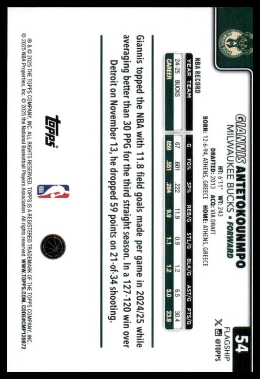 2025-26 Topps Giannis Antetokounmpo #54 Milwaukee Bucks Basketball Card NBA