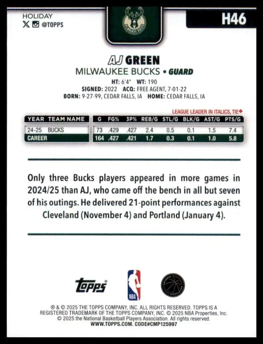 2025-26 Topps Holiday AJ Green #H46 Milwaukee Bucks Basketball Card NBA Sports