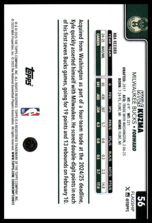 2025-26 Topps Kyle Kuzma #56 Milwaukee Bucks Basketball Card NBA Sports