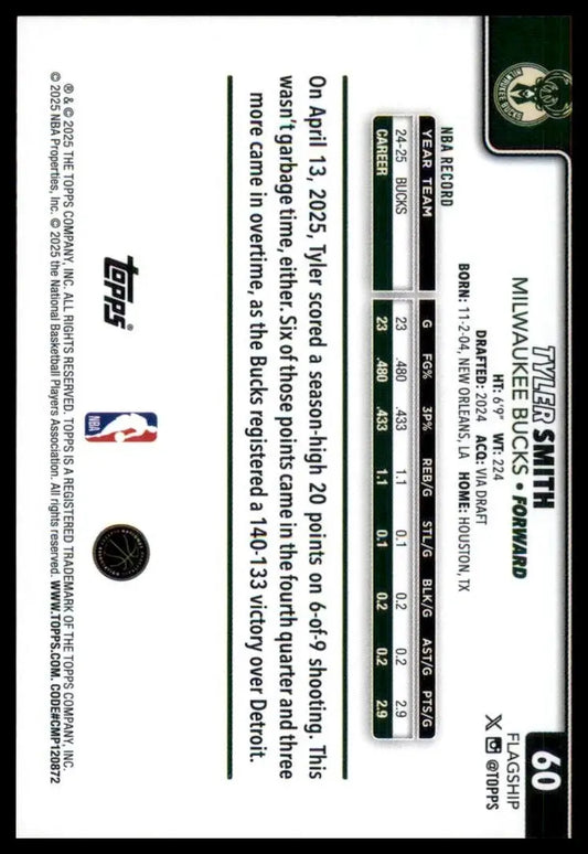 2025-26 Topps Tyler Smith #60 Milwaukee Bucks Basketball Card NBA Sports