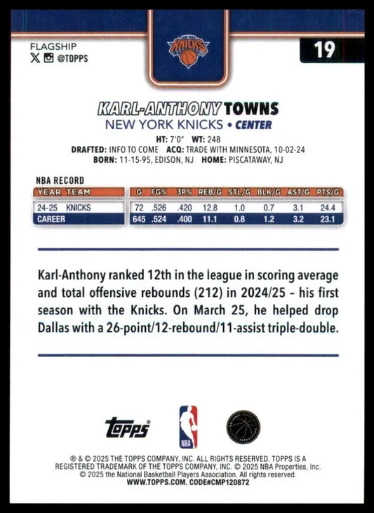 2025-26 Topps #19 Karl Anthony Towns New York Knicks Basketball Card NBA Sports