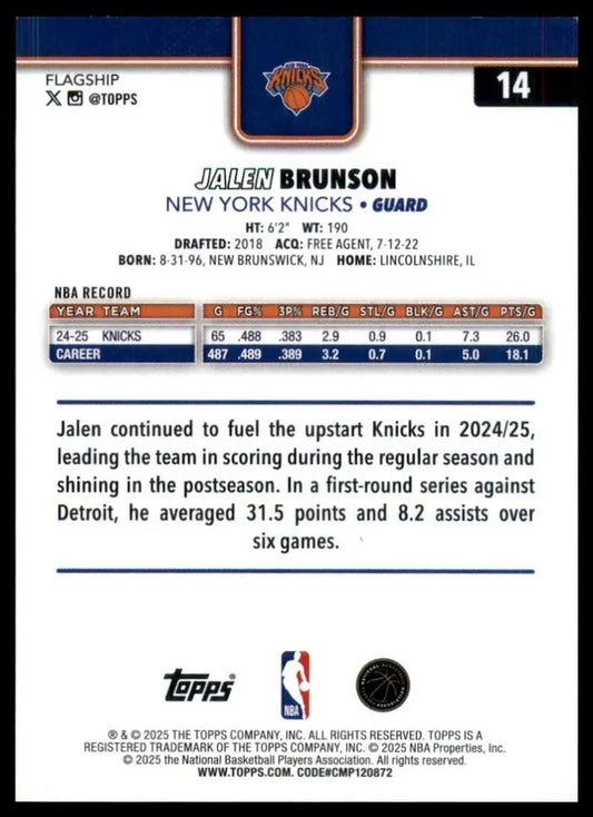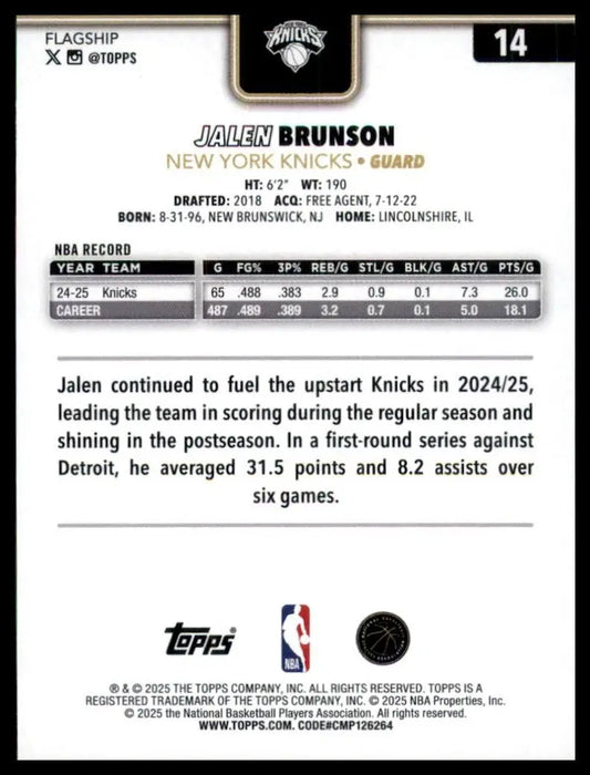 2025-26 Topps Jalen Brunson #14 New York Knicks Basketball Card NBA Sports