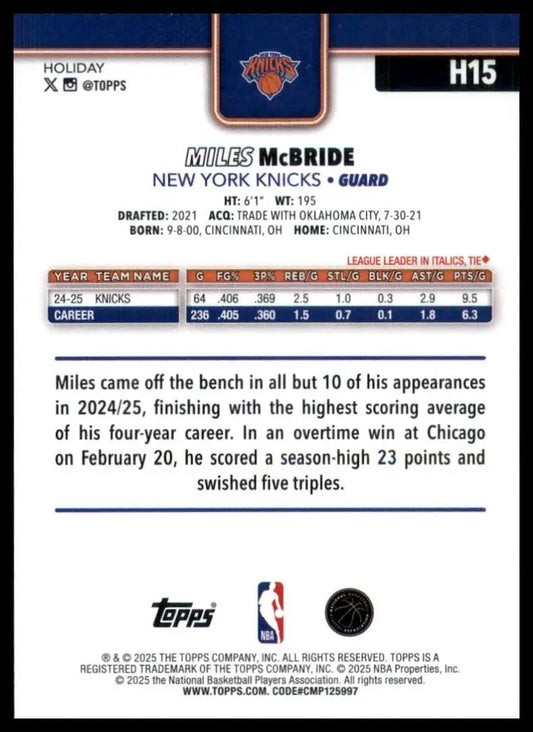 2025-26 Topps Holiday Miles McBride #H15 New York Knicks Basketball Card NBA