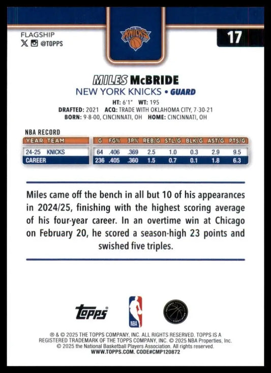 2025-26 Topps Miles McBride #17 New York Knicks Basketball Card NBA Sports