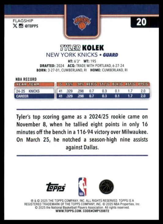 2025-26 Topps Tyler Kolek #20 New York Knicks Basketball Card NBA Sports