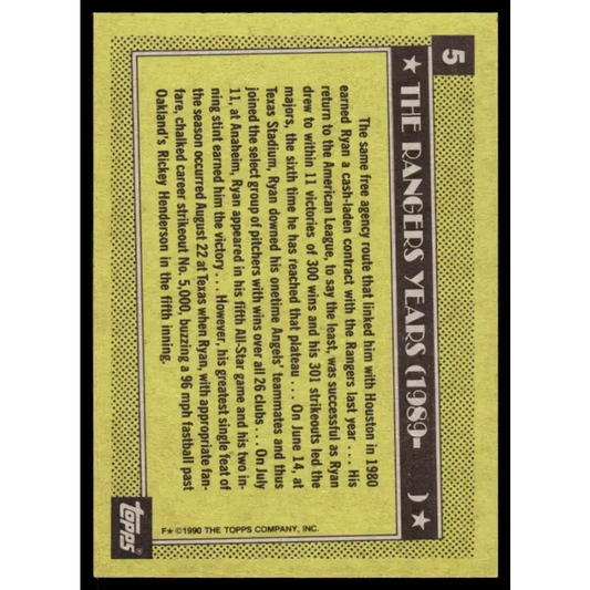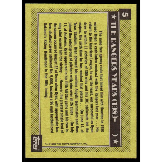 1990 Topps #5 Nolan Ryan EX/NM Texas Rangers Baseball Card