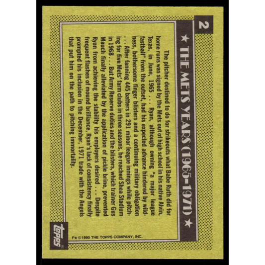 1990 Topps #2 Nolan Ryan EX/NM New York Mets Baseball Card