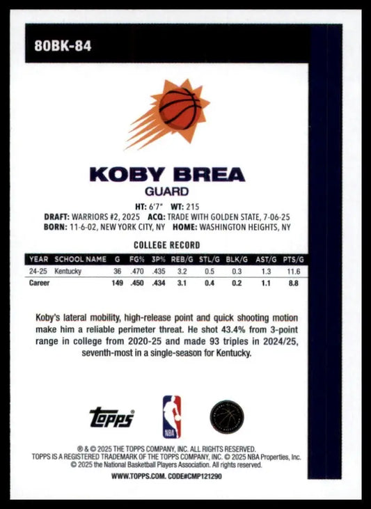 2025-26 Topps 1980-81 Anniversary Koby Brea Rookie #80BK-84 Phoenix Suns Card