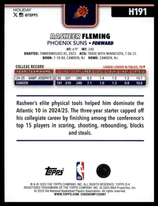 2025-26 Topps Holiday Rasheer Fleming Rookie #H191 Phoenix Suns Basketball Card