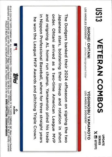 2024 Topps Update #US13 Shohei Ohtani /Yoshinobu Yamamoto NM-MT Dodgers ID:76240