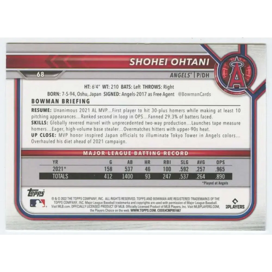 2022 Bowman #68 Shohei Ohtani NM-MT Los Angeles Angels Baseball Card