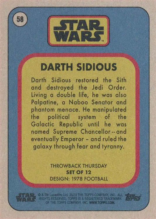 Star Wars Throwback Thursday 2023 Card #58 Darth Sidious 1978 Football