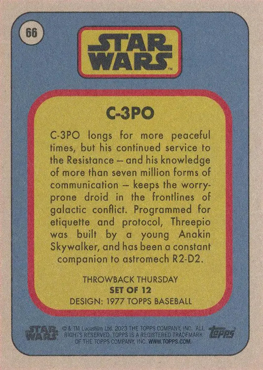 Star Wars Throwback Thursday 2023 Card #66 C-3PO 1977 Topps Baseball