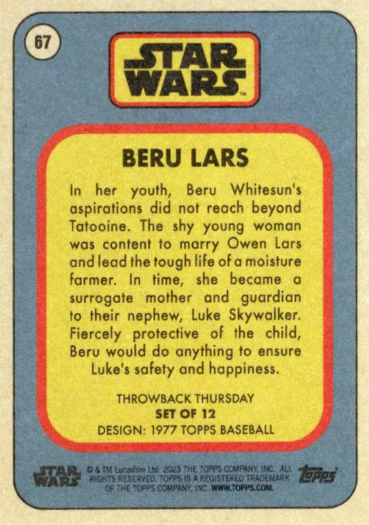 Star Wars Throwback Thursday 2023 Card #67 Beru Lars 1977 Topps Baseball