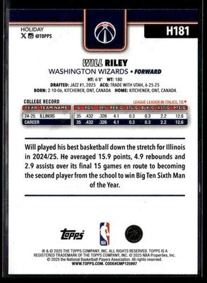 2025-26 Topps Holiday Will Riley #H181 Glitter Holiday RC Washington Wizards
