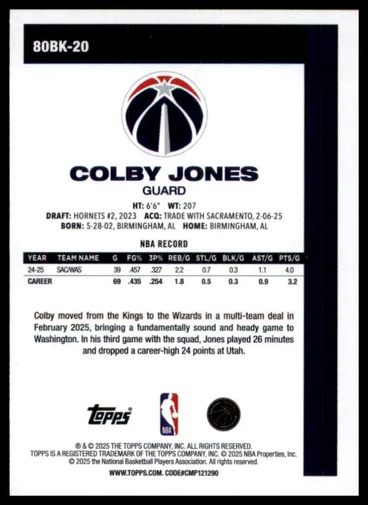 2025-26 Topps 1980-81 Anniversary Colby Jones #80BK-20 Washington Wizards Card