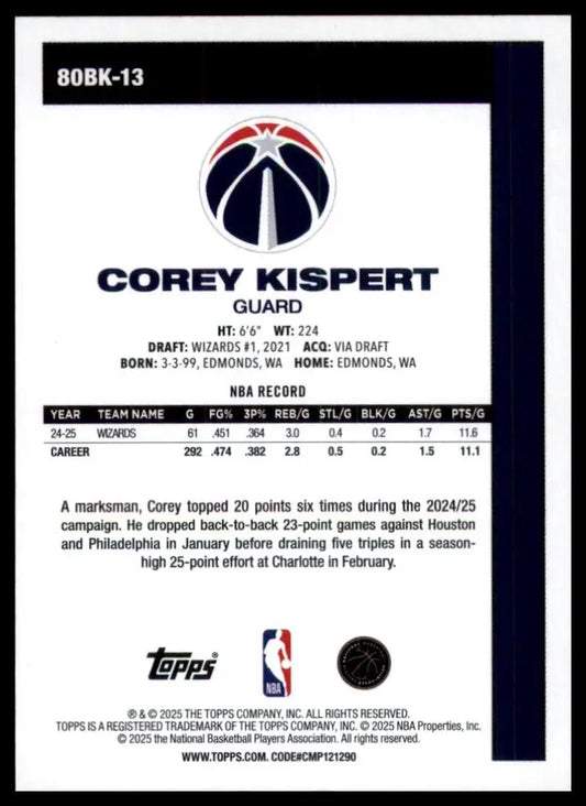 2025-26 Topps 1980-81 Anniversary Corey Kispert #80BK-13 Washington Wizards Card