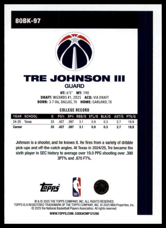 2025-26 Topps 1980-81 Anniversary Tre Johnson III Rookie #80BK-97 Wizards Card