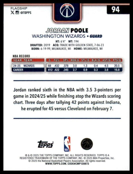 2025-26 Topps Jordan Poole #94 Washington Wizards Basketball Card NBA Sports