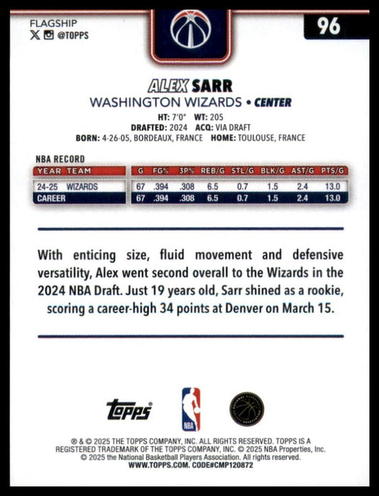 2025-26 Topps Alex Sarr #96 Washington Wizards Basketball Card NBA Sports