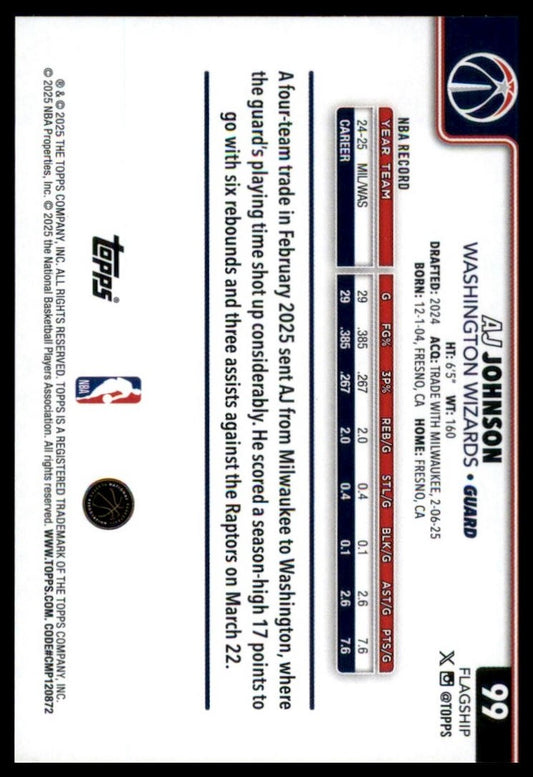 2025-26 Topps AJ Johnson #99 Washington Wizards Basketball Card NBA Sports